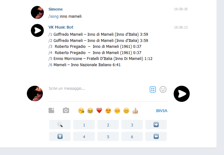 - I tasti da 1 a 6 ordinano al bot di preparare il brano corrispondente per l’ascolto/download